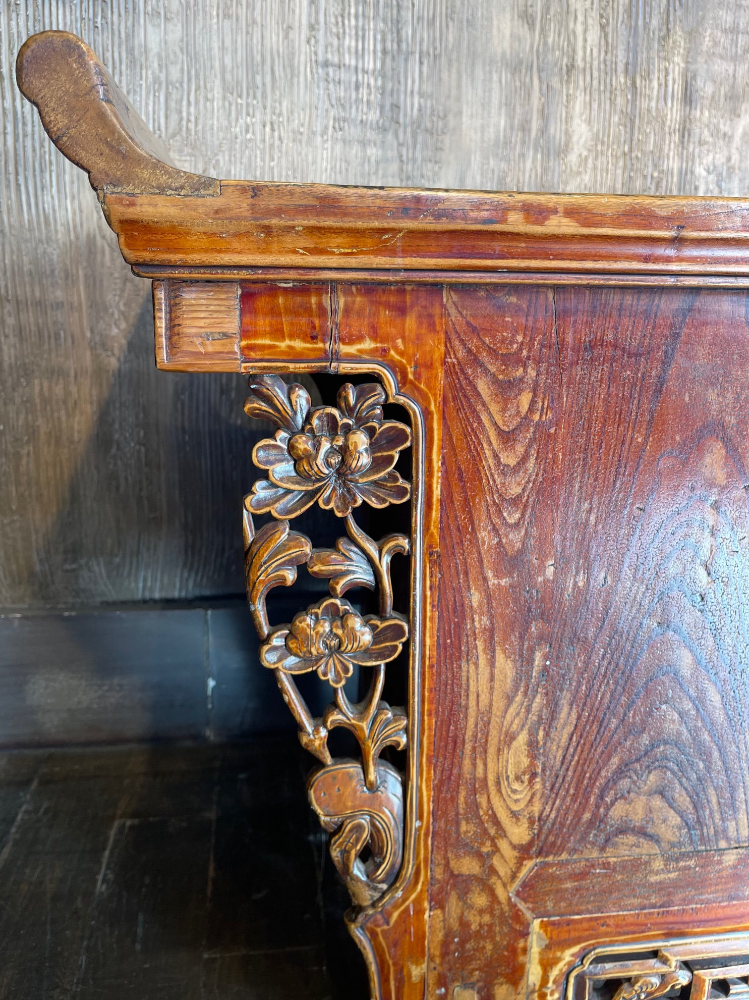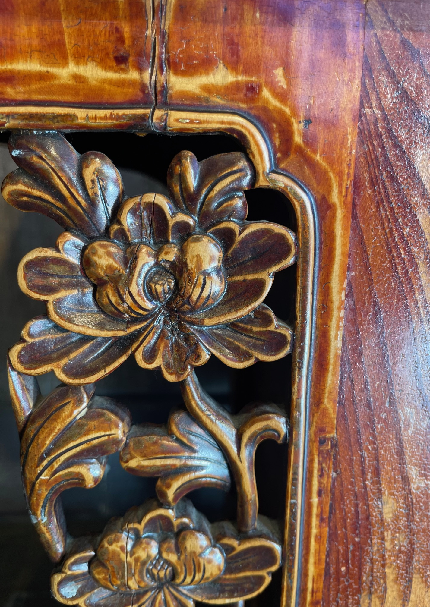 Panneaux latéraux ajourés avec motifs végétaux sculptés.